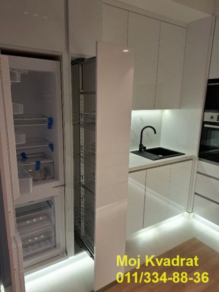 Poseduje ugradnu kuhinju sa kompletnom belom tehnikom - frižider sa zamrzivačem i sudomašina.