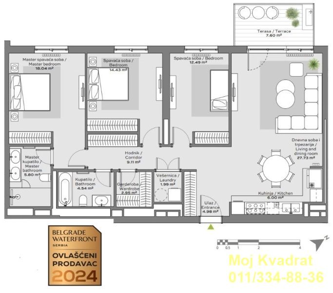 Luksuzan četvorosoban stan u zgradi BW Eterna površine 108m2 sa pripadajućom terasom od 7.60m2 sa pogledom ka Savskom parku i reci.