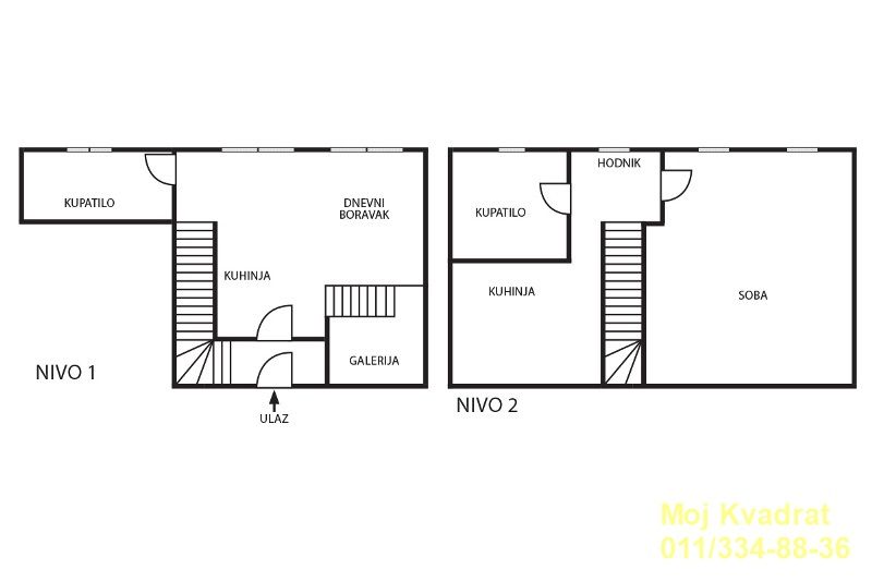 Donji nivo: dnevna soba sa kuhinjom i trpezarijom, spavaća soba na galeriji i kupatilo;