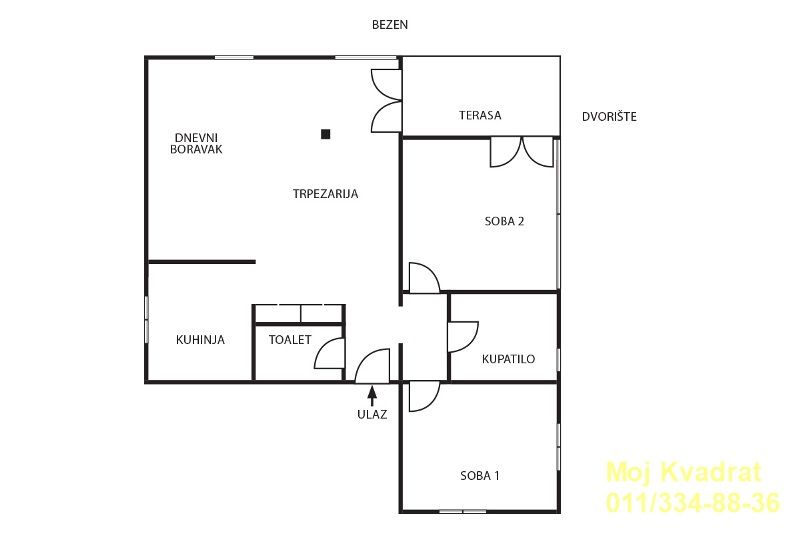 Sastoji se od ulaznog predsoblja, dnevnog boravka povezanog sa trpezarijom i terasom, odvojene kuhinje, dve spavaće sobe od kojih jedna ima izlaz na terasu, toaleta i kupatila.
