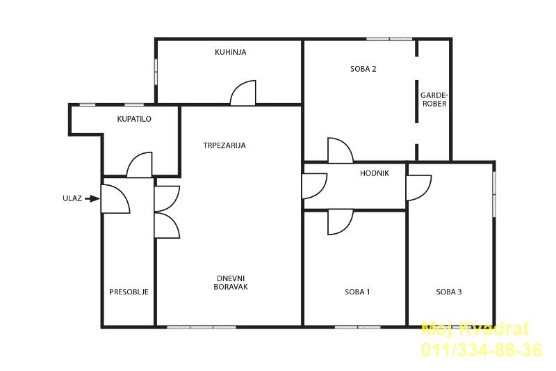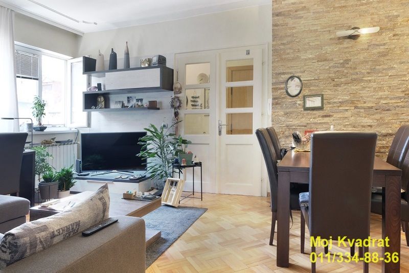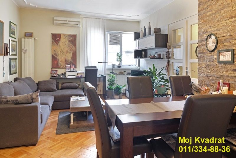 Prostorije: komotno predsoblja iz kog se levo ulazi u kupatilo, a pravo u dnevnu sobu i trpezariju, kuhinja je izdvojena (nova), kupatilo, spavaći blok sa tri spavaće sobe odvojen hodnikom. Najveća soba ima zazidan prostor za odlaganje odeće.