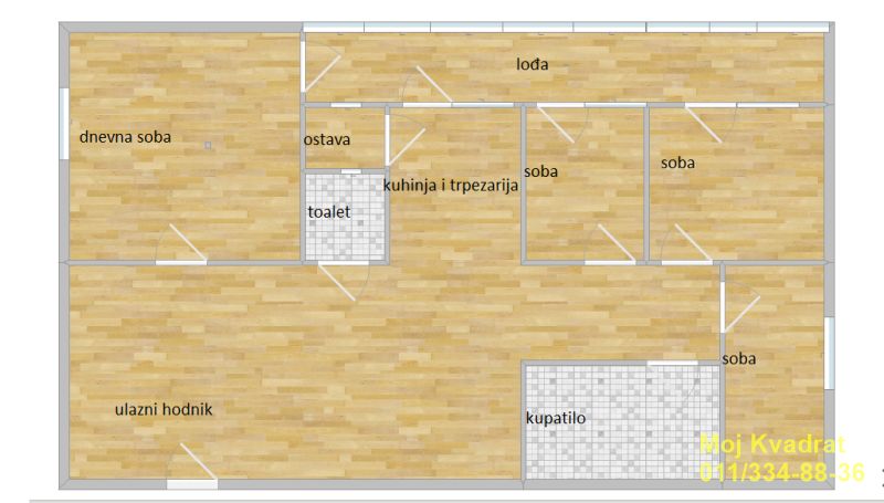 Prostorije: veliki ulazni hodnik, dnevni boravak, kuhinja sa trpezarijom, tri spavaće sobe, ostava, kupatilo, toalet.