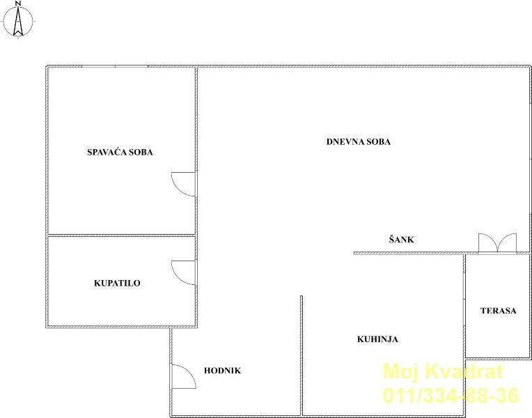 Prostorije: dnevna soba, kuhinja sa šankom, spavaća soba sa francuskim ležajem, kupatilo, hodnik, terasa.