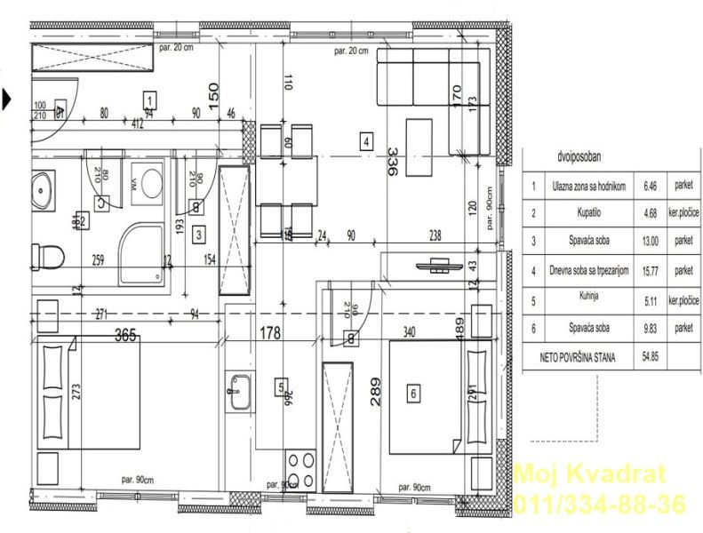 Prostorije: dnevni boravak sa kuhinjom, dve spavaće sobe, hodnik i kupatilo.