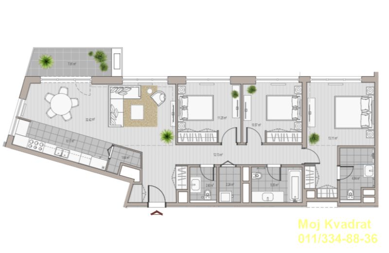 Sastoji se od dnevnog boravka povezanog sa trpezarijom i kuhinjom, master spavaće sobe sa garderoberom i sopstvenim kupatilom, još dve spavaće sobe, odvojenog kupatila, toaleta, ostave i terase.