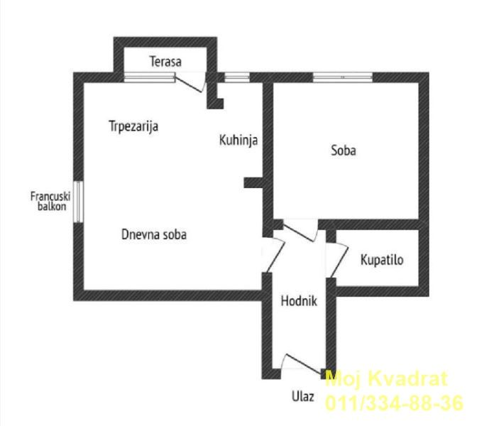Od prostorija poseduje dnevni boravak sa kuhinjom i trpezarijom, spavaću sobu, kupatilo i terasu.