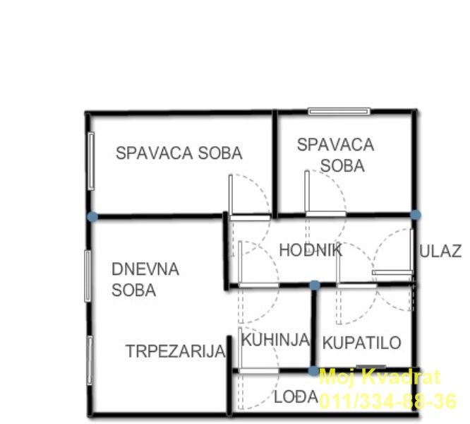 Sastoji se od ulaznog hodnika iz kog se ulazi u sve prostorije: veliki dnevni boravak sa trpezarijom i kuhinjom odvojenom šankom sa izlazom na lođu, dve spavaće sobe i kupatilo sa prirodnom ventilacijom.