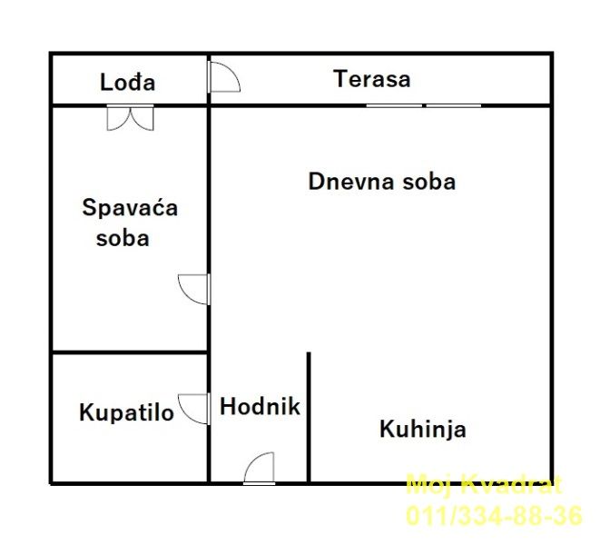 Prostorije: ulazni hodnik, dnevno-trpezarijski deo sa kuhinjom, spavaća soba, kupatilo, zastakljena lođa i terasa.
