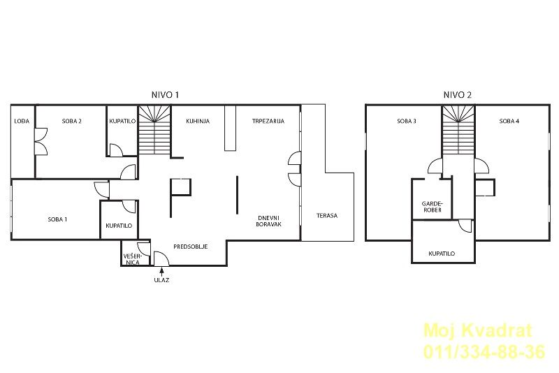 Stan je na dva nivoa. Na prvom nivou se nalazi prostrani dnevni boravak sa kuhinjom i trpezarijom, dve lepe spavaće sobe od kojih je glavna sa sopstvenim kupatilom, još jedno kupatilo, vešernica i dve terase za uživanje. Veća terasa, na koju se izlazi iz dnevnog boravka, ima divan otvoren panoramski pogled, a manja terasa, na koju se izlazi iz glavne spavaće sobe, ima direktan pogled na slobodnu zelenu površinu.