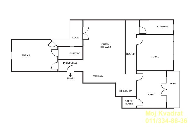 Sastoji se od predsoblja, velikog dnevnog boravka, kuhinje sa trpezarijom, tri spavaće sobe, dva kupatila i dve lođe.