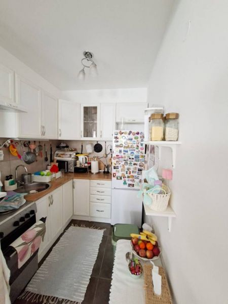 Stan se prodaje sa ugradnim nameštajem (plakari, kuhinja).