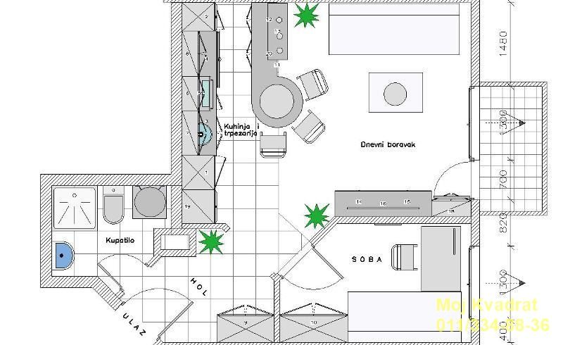 Prostorije: dnevna soba sa kuhinjom i trpezarijom, spavaća soba (dobijena postavljanjem pregradnog zida), kupatilo, hodnik i terasa.