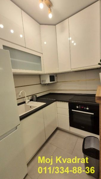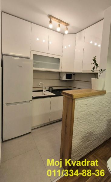 Izdaje se namešten kao na slikama, a opremljen je BOSCH tehnikom - frižider, ugradna rerna, ploča, mašina za sudove, mikrotalasna, TV, veš mašina (LG mašina za pranje i sušenje). Za manju sobu se može po želji dodati krevet ili radni sto.