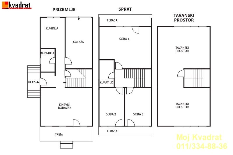 Kuća se prostire na tri nivoa - prizemlje, sprat i potkrovlje.