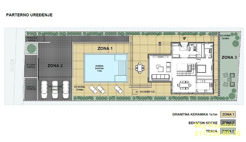 Luksuzna kuća sa bazenom i tri garaže na placu od 8.40 ari. Grejanje je podno + FAN COIL sistem, sistem toplotne pumpe vazduh-voda.