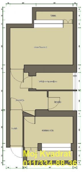 Prostorije: dnevni boravak (ka ulici), kuhinja sa trpezarijom i spavaća soba (ka dvorištu), kupatilo, terasa.