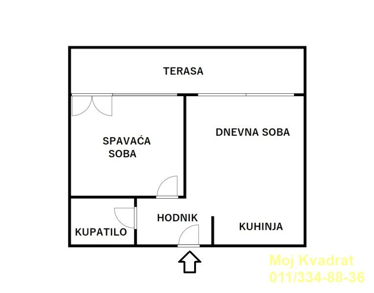 Sastoji se od ulaznog hodnika, dnevnog boravka povezanog sa trpezarijom i kuhinjom, odvojene prostrane spavaće sobe, kupatila i terase. Nema prolaznih prostorija. Kuhinja je trenutno u procesu izrade i biće završena sredinom oktobra.