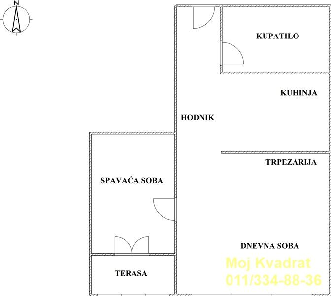 Sastoji se od ulaznog hodnika, dnevnog boravka sa trpezarijom i kuhinjom, odvojene spavaće sobe, terase i kupatila.