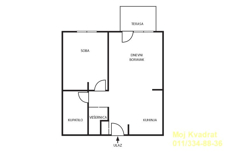 Prostorije: hodnik, prostrana dnevna soba sa trpezarijom i kuhinjom, kupatilo, terasa i ostava površine 2m2.