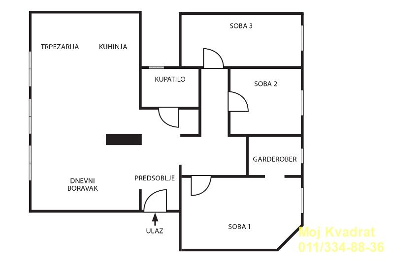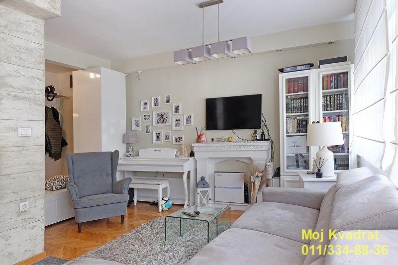 Stan je dvostrano orijentisan, zapad i istok, veoma svetao. Sastoji se od prostranog dnevnog boravka sa kuhinjom i trpezarijom, jedne veće i dve manje spavaće sobe, kupatila, ulazog hodnika. Spavaći blok je izdvojen je manjim hodnikom. Visina plafona je 2.68m, etažno je grejanje. Iznad stana se nalazi stan.