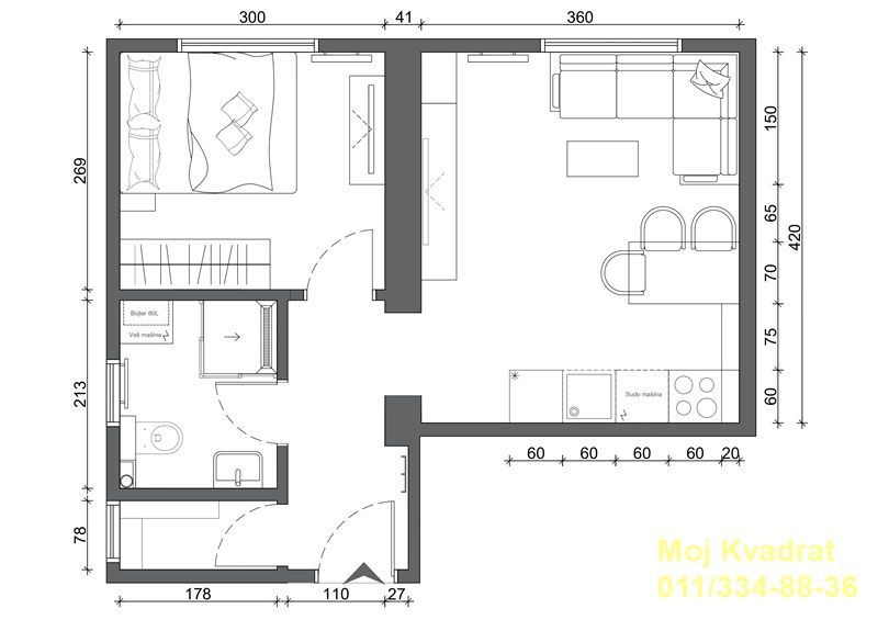 Prostorije: dnevna soba sa kuhinjom i trpezarijom, spavaća soba, kupatilo, ostava i hodnik.