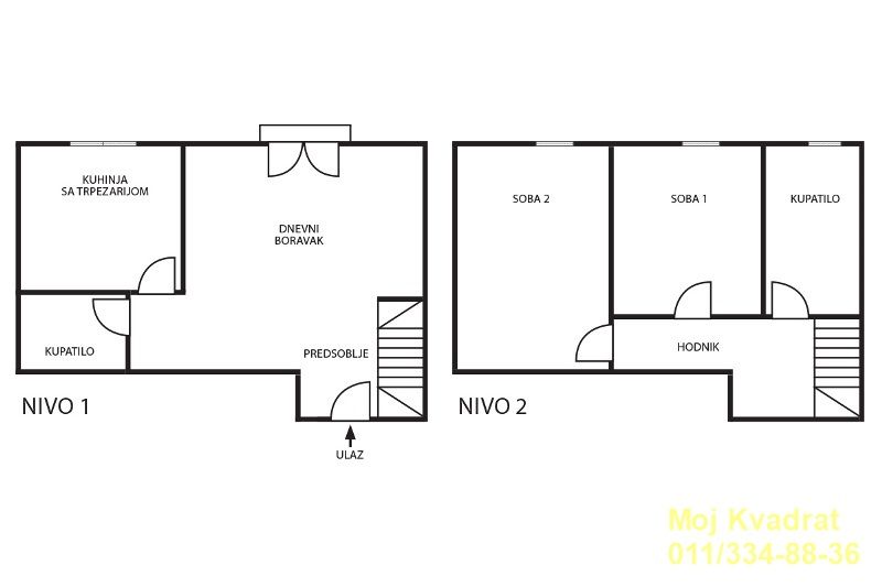 Donji nivo: dnevni boravak sa francuskim balkonom, odvojena kuhinja i trpezarija i kupatilo.
