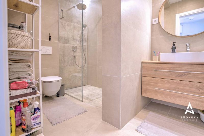 Stan se prodaje sa kompletnim nameštajem, ugradnim plakarima i kuhinjom. Ima dve lođe, dva mokra čvora, kao i ostavu na međuspratu. Grejanje je podno centralno, po potrošnji.
