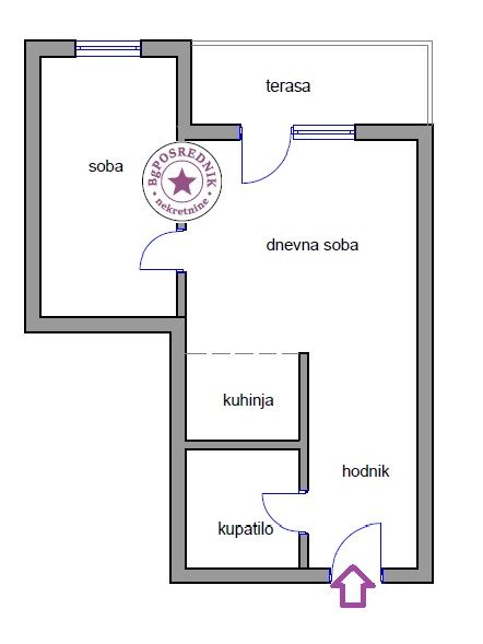 Prostorije: ulaz, kuhinja i dnevni boravak (jedinstven prostor), soba, kupatilo i terasa.