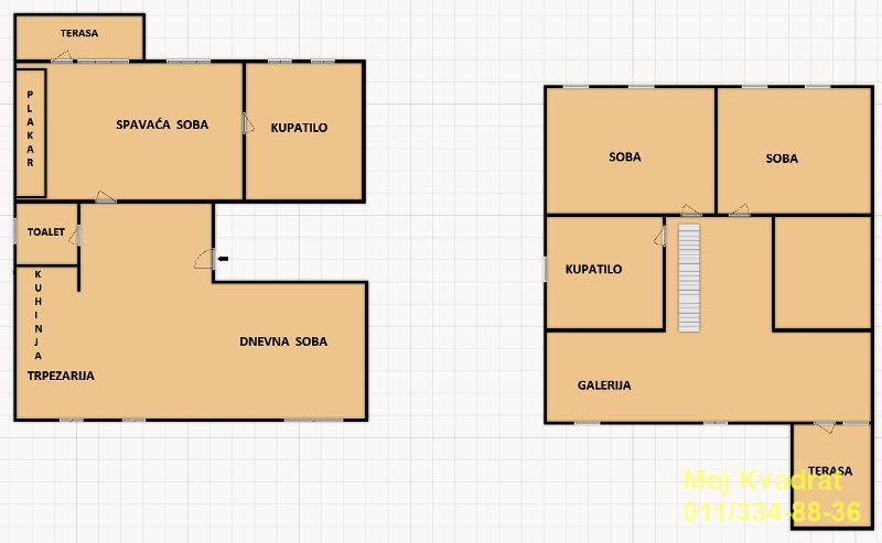 Na gornjem nivou se nalaze dve spavaće sobe, kupatilo i terasa, a na galeriji postoji prostor za formiranje još jedne sobe.