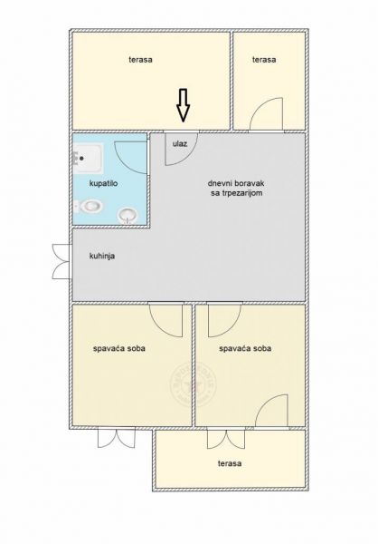 Stan poseduje dve terase, hodnik, kupatilo, dve spavaće sobe i dnevni boravak sa trpezarijom i kuhinjom.