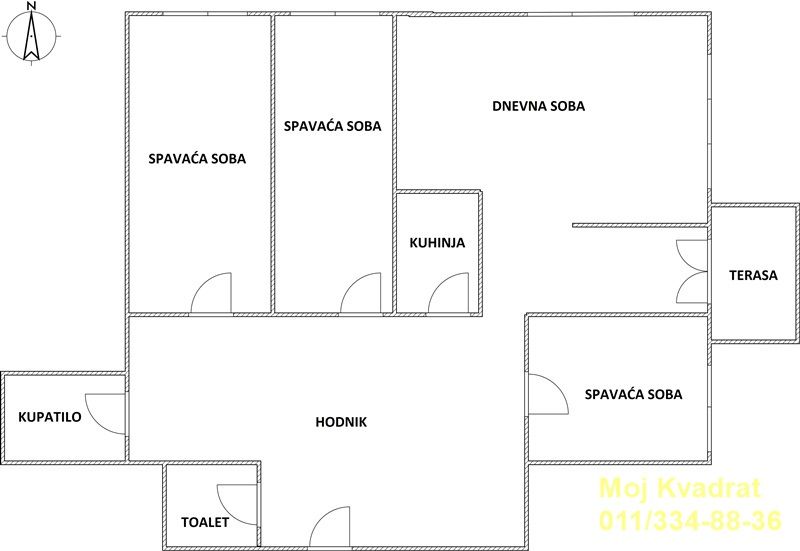 Prostorije: hodnik, dnevna soba, kuhinja, trpezarija, tri spavaće sobe, kupatilo, toalet i lođa. Sve prostorije su povezane hodnikom.