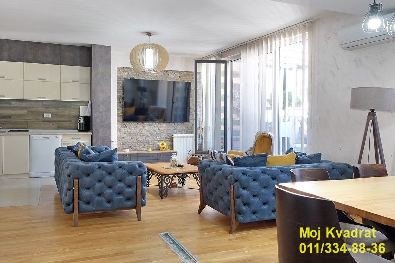 Stan je opremljen kvalitetnim materijalima i nameštajem: granitnim pločicama španskog proizvođača, prirodnim kamenom, nameštajem „Simpo“ i „Ikea“ brenda, kao i trpezarijskim nameštajem od punog drveta, tehnikom „Tesla“ i „Whirlpool“ proizvođača i bio-kaminom. Terasa poseduje staklenik sa kliznim sistemom, električne „screen“ zavese, veštacke zelene zidove, kao i prirodno zelenilo od bambusa i bora.